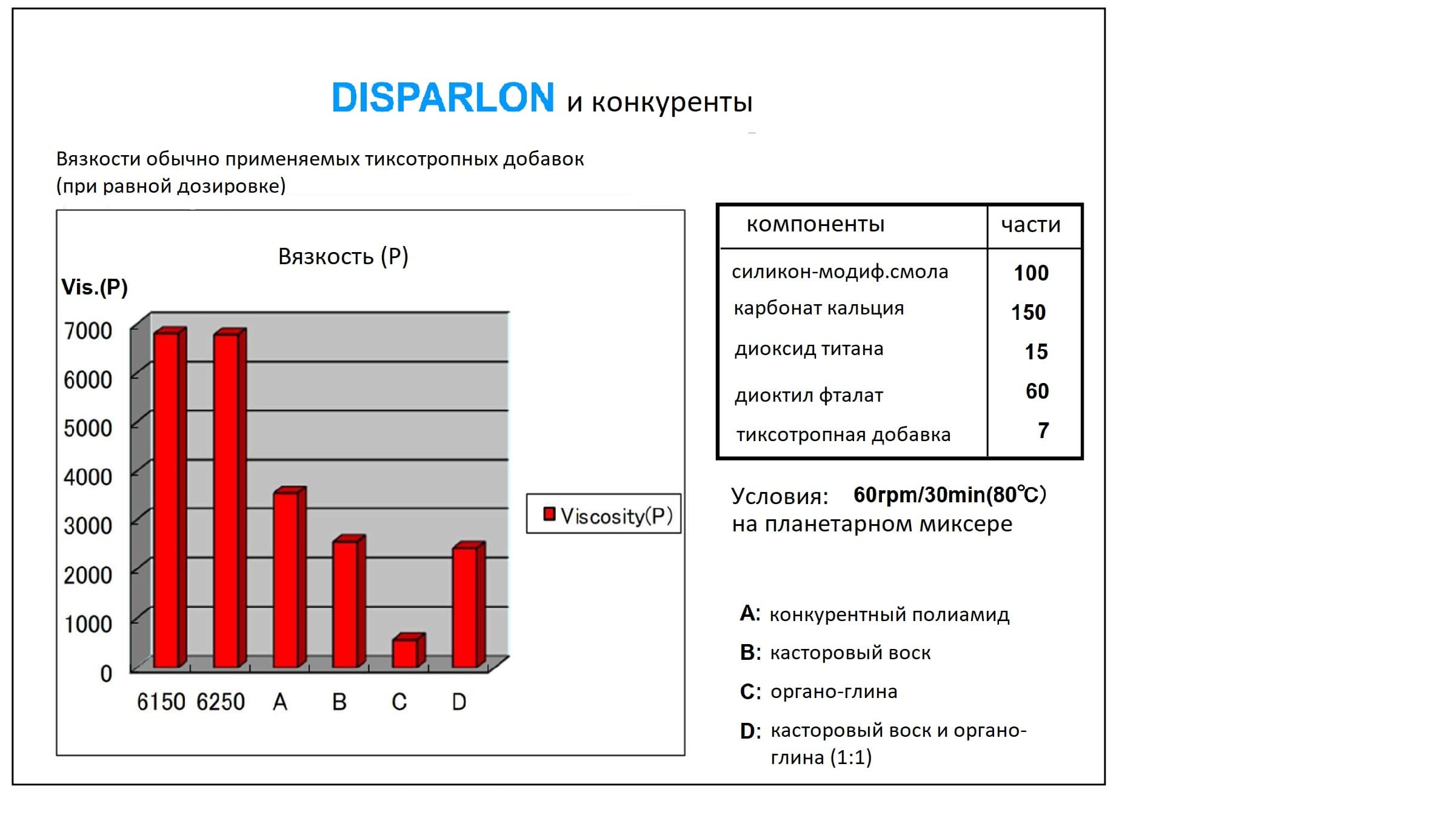 В 2К рецептурах используется диоксид кремния (в силиконовых герметиках) и карбонат кальция (в остальных герметиках). Базовые показатели различных тискотропных добавок, говорят о бесспорном преимуществе реологических добавок Disparlon® полиамидного типа: 6500, 6150, 6250.