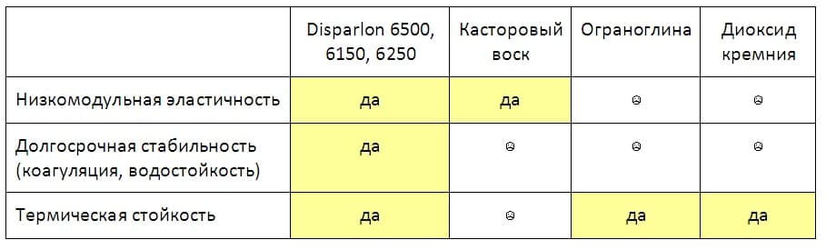 - Disparlon6250(Диспарлон 6250) – также на основе амидного воска, но другого типа, разработана для ещё более низкой температуры активации