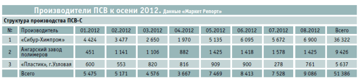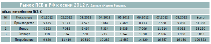 Российский рынок ПСВ за десятилетие пережил не менее двух скачков. В 2005 году производство выросло почти на порядок, резко опустившись впоследствии до уровня в 25+-2 Кт. Это было в 3-4 раза ниже показателей импорта, который иногда даже превышал 100 Кт. В 2012 году ожидается дальнейшее его снижение – правда, не очень большое. При «правильном» развитии ситуации импорт будет снижаться и в 2013 году.