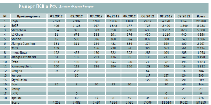 Можно заметить, что импорт сейчас держится в основном на поставках из Китая и Кореи – причем корейских с каждым годом все больше (за счет уменьшения китайских и европейских). Почти все китайцы (в том числе тайваньская Taita) и корейцы (кроме Dongbu) поставляют без перебоев даже в «несезонные или плохие» месяцы. Но и западный капитал не оставляет своих позиций. В 2011 году лидерами по поставкам среди компаний согласно наравне с Loyal Chemical (18% от объема импорта) и LG Chem стала BASF (по 13%). В 2012 году BASF и Styrochem поставляли ежемесячно, уступая по объемам лишь одной китайской суперкомпании Loyal, IneosNova попадает в топ-8 поставщиков, а DOW, Dwory и другие еврогранды регулярно «светятся» на рынке периодическими поставками.