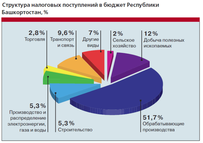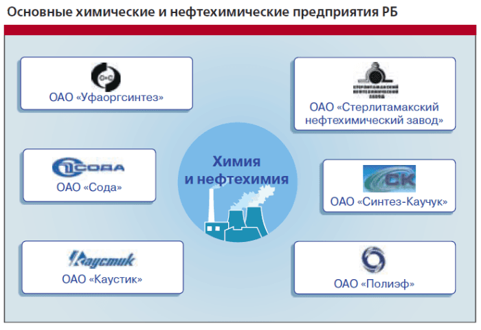 Нефтехимический комплекс Башкортостана представлен известными в стране и мире предприятиями: «Уфа-нефтехим», Уфимский нефтеперерабатывающий завод, «НОВОЙЛ», «Газпром нефтехим Салават», «Полиэф», «Сода», «Каустик», «Каучук» и др. В республике более половины налоговых поступлений в бюджет от обрабатывающих производств приходится на нефтепродукты, и около 10% — на химическую отрасль. Доля налоговых поступлений от нефтехимических предприятий в бюджет республики составляет более 20%.