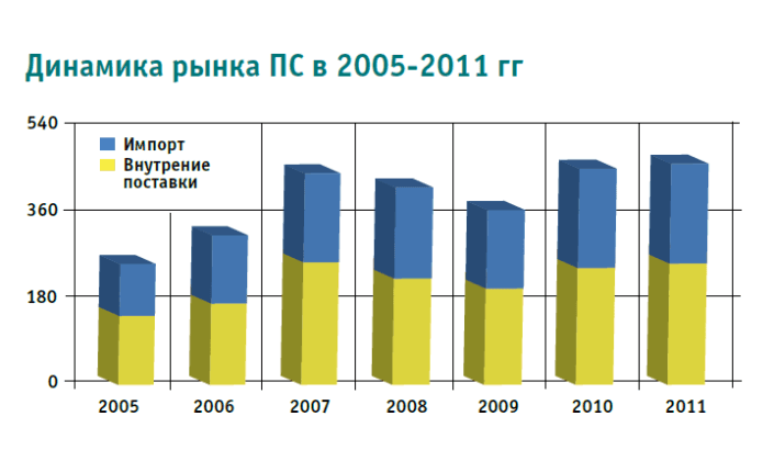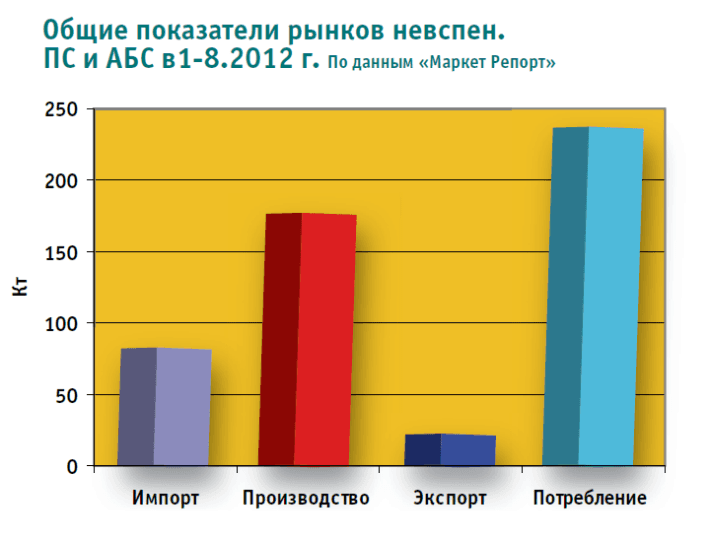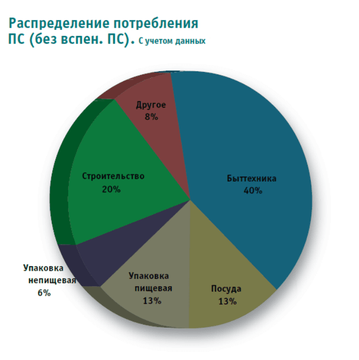 Высокое потребление ПС и развитый рынок в России обусловлены сравнительно динамичным развитием в ПС-потребляющих отраслях – строительстве (пенопласт и листы), электронике (производство корпусов и деталей быттехники), упаковочной отрасли (посуда, пеноупаковка), а также автопроме – детали, обшивка. Кардинальное отличие российского рынка от украинского и других импортозависимых в СНГ. По сегменту «ударопрочный ПС» (УПС или УПС/М) и «ПС общего назначения» (ПСС или ПСС/М) Россия обладает мощным производственным комплексом, который будет модернизироваться и расширяться как минимум до 2020 года. На него же, по оценкам «Кортес», приходится 70 - 75% потребления ПС (еще 6% на АБС, остальное пространство, очевидно, занимают пенопласты). В целом, отечественный ПС в последние годы удовлетворяет 50 - 60% внутреннего рынка.