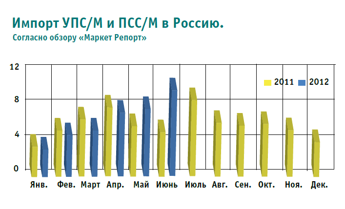 Поскольку потребление приближается к 300 Кт (288 Кт в 2011 году), остается актуальным импорт. Ожидается, что в дальнейшем импорт по обоим типам ПС будет снижаться по мере разрастания НКНХ и других гигантов ПС-производства. Но пока импорт растет уже почти 10 лет, испытав лишь некоторое падение в 2009 году. Импорт 2012 года до мая был слабее, чем в 2011 году, но затем активизировался выше прошлогодних объемов – что особенно заметно по августу и июню. Рост шел в сегменте ПСС – например, за 1 - 6.2012 года импортировано 25,912 тонн ПСС/М, что на 29% превышает поставки 1 - 6.2011 года. По итогам мая 2012 года достигнут исторический максимум в импорте ПСС/М (6 Кт), а в июне 2012 года импорт ПСС/М вырос еще на 11% (до 6,7 Кт). Для УПС, наоборот, импорт за 1 - 6.12 был заметно ниже, чем 1-6.11.