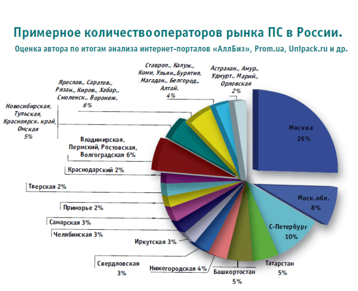 Всего на рынке работает 250 - 300 операторов. Ведущая роль в потреблении ПС принадлежит столичным регионам, причем свыше четверти операторов базируются и ведут бизнес в самой Москве. Весьма значительна доля регионов-продуцентов (Татарстан, Башкирия, Нижегородская), а также больших и некоторых сибирских регионов (Приморский, Иркутский) и некоторых развитых центральных регионов. Однако многие регионы центральной и южной России, ряд сибирских и северных краев не испытывают больших потребностей в монолитных ПС-листах и изделиях, хотя во многих из них очень популярен пено-ПС.