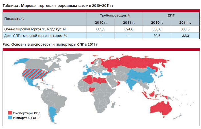 Ситуация на рынке СПГ полностью зависит от рынка природного газа (ПГ). Согласно последнему статистическому отчету экспертов British Petroleum (Великобритания), в 2011 году мировой рынок природного газа в целом демонстрировал достаточно стабильную динамику, хотя темпы роста оказались ниже: спрос вырос всего на 2,2%, а в большинстве развитых стран темпы роста оказались еще более скромными. Только страны Северной Америки, благодаря низким ценам, существенно увеличили объемы потребления природного газа. В Азии традиционно Китай и Япония увеличили потребление на 21,5 и 11,6% соответственно. В списке активно использующих сырьевой и энергетический потенциал природного газа — и Ближний Восток (прирост в 2011 году составил 13,2%). Спрос на данный вид сырья в Евросоюзе в связи с экономическими проблемами, высокими ценами, благоприятными погодными условиями и дальнейшим расширением программ по использования возобновляемых источников энергии снизился на 9,9%.