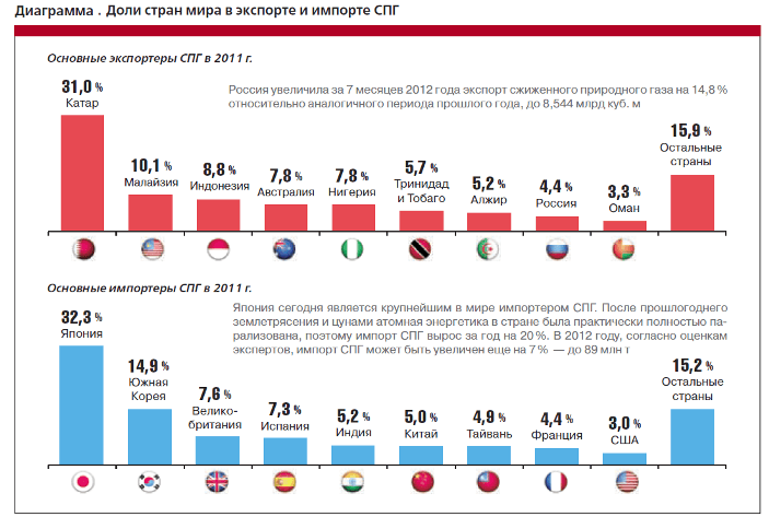 вынуждены будут отказаться от этой деятельности, значительно сократив расходы на разработку новых месторождений. Многие американские экономисты считают, что экспорт СПГ — не самый лучший вариант, когда им можно заменить в энергетическом балансе страны более дорогой уголь, или развивать газохимию, используя газ в качестве сырья, и экспортировать продукты с более высокой добавленной стоимостью. США незначительные объемы ПГ экспортируют достаточно длительное время, например, по трубопроводу в Мексику и Канаду с конца 30-х годов прошлого столетия. В 2010 – 2011 годах более 90% экспорта приходилось именно на эти страны. С 1969 года США экспортировали незначительные объемы СПГ через терминал Kenai, Аляска, однако к концу 2011 года его работа была приостановлена.