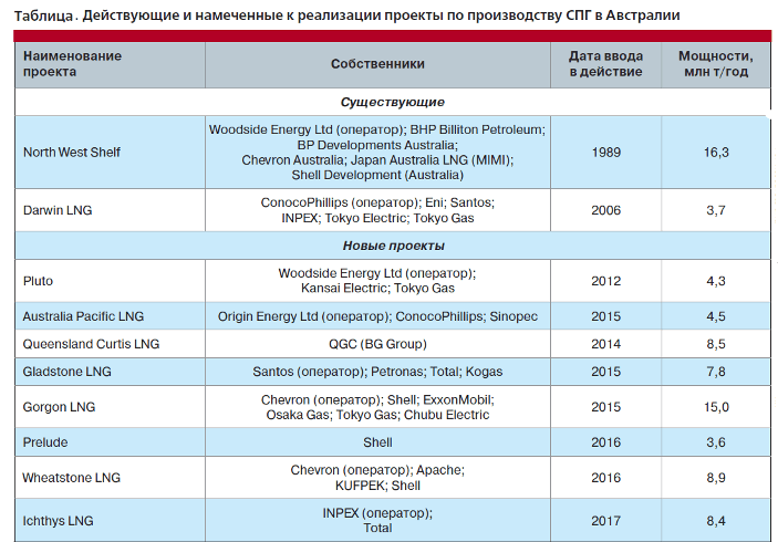 В 2011 году Австралия экспортировала около 19 миллионов тонн в год (26 миллиардов кубометров в год) СПГ, что составило 8% от объемов мирового экспорта, то есть почти в два раза больше российских экспортных объемов. Благодаря территориальной близости к Азиатскому региону и стабильному кредитному рейтингу, инвесторы достаточно смело вкладывают свои средства в развитие производств и инфраструктуры для экспорта СПГ. В настоящий момент около двух третей вновь вводимых мощностей по сжижению ПГ строится именно в Австралии, а это почти 50 миллионов тонн СПГ в год (68,5 миллиарда кубометров в год). После реализации всех проектов, к 2015 году, регион станет вторым после Катара крупнейшим экспортером СПГ в мире.