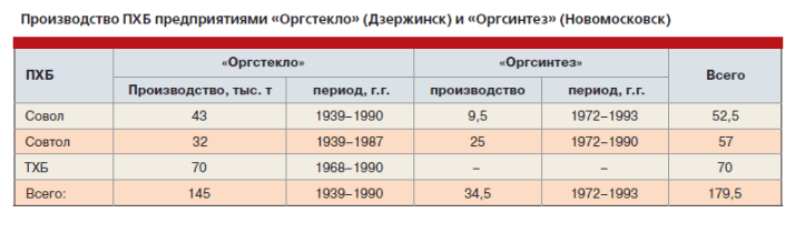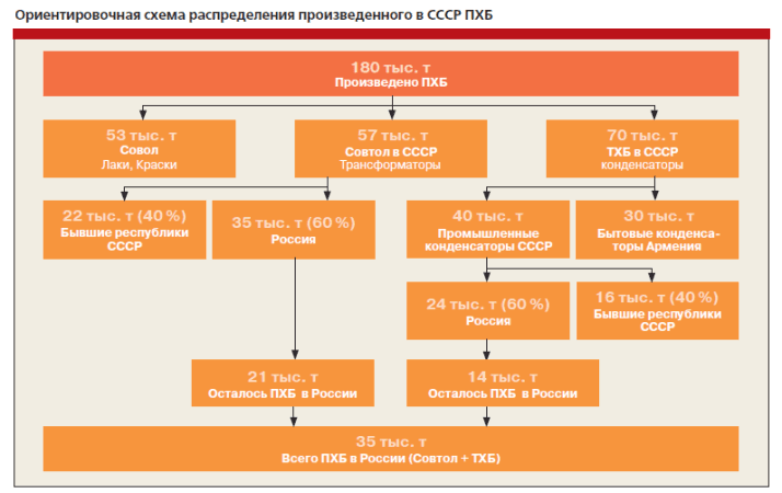 В бывшем СССР наиболее широкое промышленное применение получили трихлорбифенил, а также различные марки совола, представляющие собой очищенные смеси тетра- и пентахлорбифенилов, и совтола (смесь совола и трихлорбензола). Производство полихлорбифенилов (ПХБ) осуществлялось в период 1939–1993 годы. К настоящему времени в энергосистемах и других отраслях промышленности находится около 10 тысяч трансформаторов и 500 тысяч конденсаторов, в которых в качестве диэлектрика используется ПХБ. Общий объем ПХБ в этом оборудовании оценивается в 30 тысяч тонн.