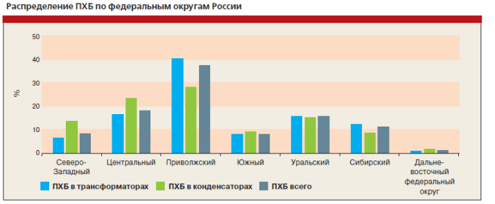 Как выше указано, в настоящее время в России на складах и в технических устройствах (трансформаторах, конденсаторах) скопилось не менее 30 тысяч тонн ПХБ. Общая картина загрязнения ПХБ по регионам выглядит следующим образом: 62 % ПХБ приходится на два региона (Поволжский, Уральский), по Дальневосточному округу и Калининградской области данные отсутствуют, в остальных регионах эта цифра колеблется от 0,2 до 8,3 %.