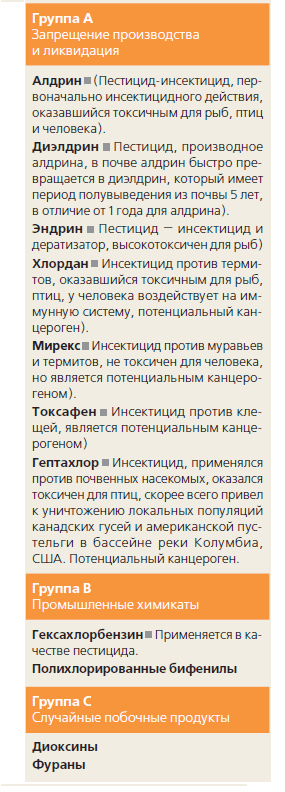 К первой группе СОЗ относят устаревшие и запрещенные пестициды: альдрин, хлордан, дильдрин, эндрин, мирекс, гептахлор, гексахлорбензол, токсафен, дихлор-дифенил-трихлорэтан (ДДТ), хлордекон, пентахлорбензол, линдан (гамма-гексахлорциклогексан), альфа- и бета-гексахлорциклогексан. Практически все они, кроме ДДТ, не только давно запрещены, но и производство их закрыто. Остались только неизрасходованные запасы в хранилищах, да загрязненные ими почвы. Известный ДДТ стоит особняком, так как многие страны до сих пор используют его против опасных насекомых, переносчиков таких болезней, как малярия (Индия, некоторые страны Африки, Центральной и Южной Америки) или клещевой энцефалит (Россия).