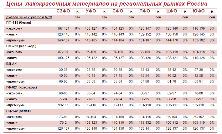 В октябре спрос на ВД ЛКМ снизился по всей стране, а стоимость не изменилась, несмотря на то, что цена как диоксида титана, так и дисперсий, ниже, чем летом. Сейчас на рынке продукция для наружных работ практически не востребована, а краска для внутренней отделки помещений по-прежнему пользуется спросом, но в меньших объемах, чем в прошлом месяце. В зависимости от региона сбыта уровень спроса в октябре на ВД ЛКМ для внутренних работ не изменился. Игроки рынка отмечают стабильные показатели продаж только в Центральном и Южном регионах России и на северо-западе.
