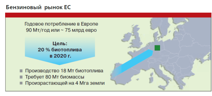 Сегодня биоэтанол — реально используемое топливо. Руководство ЕС поставило цель: довести долю биотоплива в общем топливном балансе к 2020 году до 20%. Для реализации поставленной цели необходимо производить 18 миллионов тонн биотоплива, на это потребуется 80 миллионов тонн биомассы, произрастающей на территории площадью в 4 миллиона гектаров. Для получения этанола из непищевого сырья, например из водорослей, необходима значительно меньшая территория.