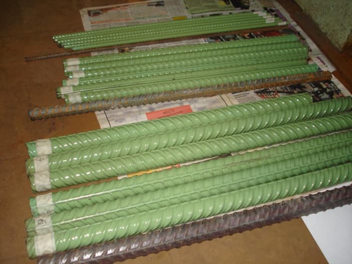 Механизм коррозионного разрушения арматуры в железобетонных сооружениях может быть проиллюстрирован практическим тестом, проводившемся во Флориде в течение 10 лет. В зоне морского прилива были установлены железобетонные столбики, часть из которых была изготовлена из арматуры с эпоксидным покрытием, часть – из арматуры без покрытия. Через 7 лет столбики, изготовленные из арматуры без покрытия, стали растрескиваться, демонстрируя серьезные коррозионные разрушения. Столбики, обработанные покрытием, оставались в отличном состоянии.