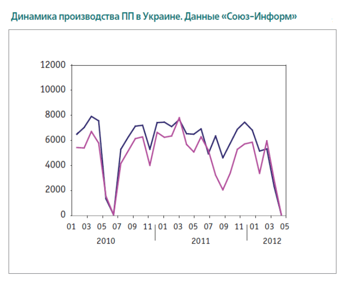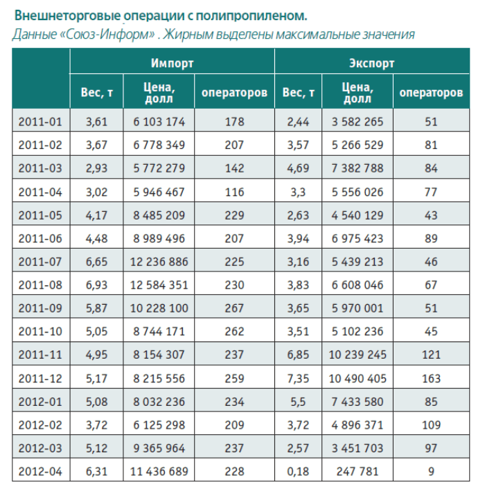 Касательно объемов импорта поступают разные сведения. Достойным доверия можно считать июньский обзор «Маркет Репорт», согласно которому импорт вырос, да еще и на 45%. Зимне-весенняя стагнация первого полугодия 2011 года не стала традицией, продержавшись до апреля. Затем последовал быстрый рост, очевидно обусловленный закрытием производства на ЛИНИКе. В мае поставлен рекорд (11 Кт), и, судя по сезонной летней активизации, это может быть не предел. Действительно, согласно «Юнипак», с марта украинские компании на фоне заявлений руководства ТНК об остановке ЛИНИКа начали активно контрактовать полипропилен на внешних рынках. По данным же «Союз-Информ», при похожей динамике объемы импорта значительно скромнее, и максимум-2011 не достиг даже 7 Кт, а в 2012 году импорт вырос только в апреле.
