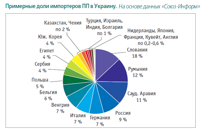 Экспорт до последнего момента (до остановки ЛИНИКа) имел внушительные объемы, иногда (зимой и в марте 2011 года, январе 2012 года) превышая объемы импорта. Причем экспортом занималось немало предприятий – в среднем по 70 10 за месяц, а иногда в 1,5-2 раза больше. Основными покупателями выступали Россия (до 50 Кт в год) и другие страны экс-СССР (Узбекистан, Молдавия, Литва, Беларусь), а также Турция (вторая после России – более 7 Кт), Румыния, Польша и даже западноевропейские «суперэкономики» (Франция, Италия, Германия). То есть украинский ПП был вполне востребован на самых развитых и требовательных рынках.