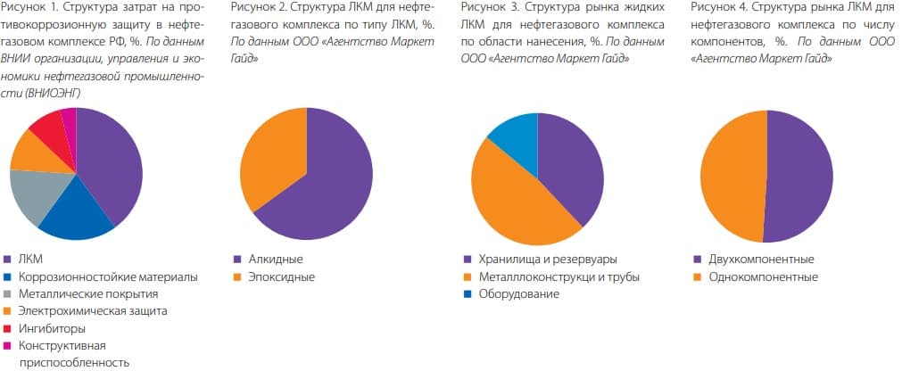 Можно выделить несколько сегментов рынка антикоррозионных покрытий для защиты внутренних и наружных поверхностей по области применения: резервуарные парки для хранения нефтепродуктов, трубопроводы (газовые и нефтяные; морские и сухопутные; промысловые и продуктовые), металлоконструкции нефтегазопромысловых и транспортных сооружений, технологическое оборудование. Соответственно, наиболее массовым сегментом, с большим объемом спроса, является окраска резервуаров для хранения нефтепродуктов. В наиболее узких сегментах, таких как оффшорные проекты, правят бал преимущественно зарубежные производители.