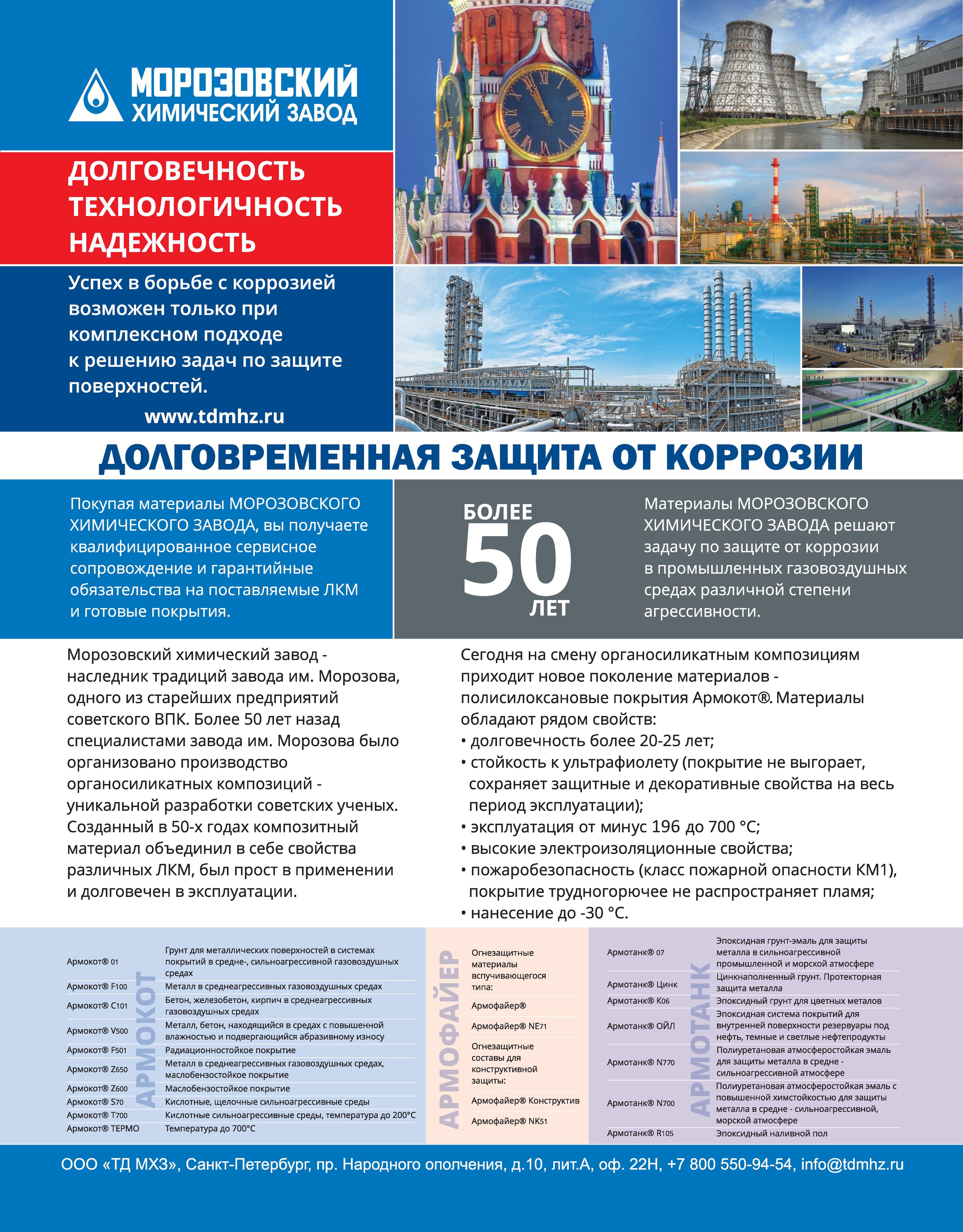 Дмитрий Смирнов, генеральный директор «ТД Морозовского химического завода» Уровень конкуренции на рынке защитных материалов для нефтегазовой отрасли – очень серьезный. Однако, АО «Морозовский химический завод» занимает ведущие позиции в сфере антикоррозионных материалов для нефтегазовой отрасли благодаря активной инновационной политике: мы разрабатываем и выводим каждые несколько лет на рынок новые линейки ЛКМ, соответствующие самым высоким требованиям. Так, например, в 2008 году завод освоил выпуск новейших полисилоксановых покрытий «Армокот®», в 2010 году на рынок был выпущен огнезащитный материал «Армофайер®», в 2014 году началось производство новой линейки эпоксидных и полиуретановых материалов «Армотанк®». Мы постоянно работаем над улучшением рецептур выпускаемых антикоррозионных составов, неусыпно контролируем их качество. Эти задачи решает заводская лаборатория, оснащенная современным лабораторным оборудованием, а также отдел лакокрасочных покрытий для совершенствования технологий нанесения материалов. Сегодня для обеспечения долговременной и надежной защиты промышленных объектов уже мало только выпускать хорошие по качеству материалы. Важно также предоставить комплекс технического сопровождения производимых ЛКМ, который гарантировал бы максимально эффективный жизненный цикл покрытий. Сегодня при АО «МХЗ» действует сервис-центр. Команда центра помогает клиентам подобрать эффективный ЛКМ, осуществить инспекторский надзор, найти добросовестного подрядчика и организовать выполнение покрасочных работ, а также проводит обучение и консультирование специалистов наших заказчиков, ответственных за реализацию мероприятий по антикоррозионной защите. Именно поэтому лакокрасочные покрытия производства АО «МХЗ» отлично зарекомендовали себя среди российских нефтегазовых предприятий. Антикоррозийные материалы нашего производства успешно используются на объектах Газпром, Газпром нефть, Лукойл, Роснефть, Башнефть, Новатэк и др.