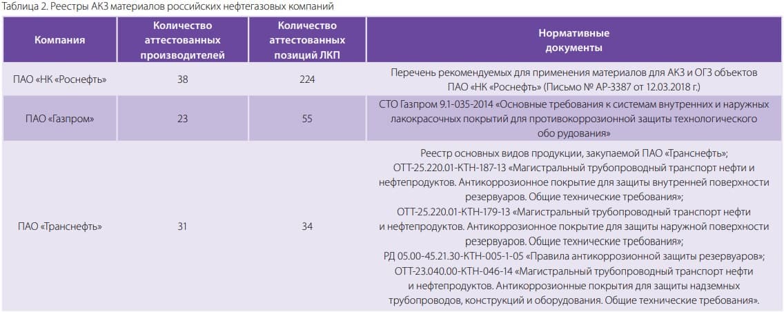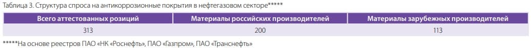 Кроме того, предприятия нефтегазового сектора принимают собственные руководящие документы (РД), стандарты, и реестры (см. табл.2 и табл.3), где прописаны не только предпочтительные материалы, обеспечивающие необходимые защитные свойства, но и методологические указания не только по условиям нанесения защитных покрытий. Таким образом, рынок антикоррозионных составов – это рынок покупателя, монопсония.
