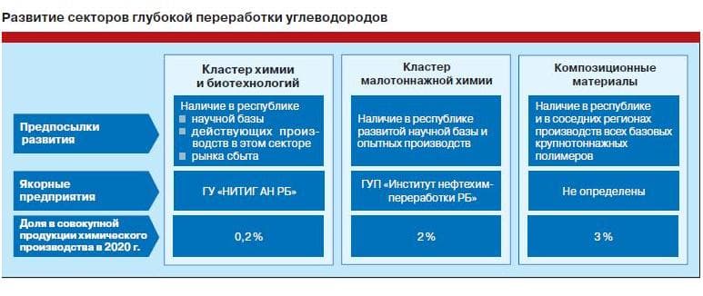 К 2020 году доля малотоннажной химии увеличится до 2% от совокупного объема химической продукции республики, доля композиционных материалов — до 3%. По ряду направлений якорные предприятия уже определены. В республике создан кластер химии и биотехнологий для сельского хозяйства. Принято решение о создании кластера малотоннажной химии на базе республиканского Института нефтехимпереработки. Пока слабо представлен сектор резиновых и пластмассовых изделий, ведется активный поиск инвесторов для данного сегмента, тех, кому этот бизнес будет интересен. Остается в приоритетах развитие отрасли минеральных удобрений. «Газпром нефтехим Салават» открыл новое производство мощностью 360 тысяч тонн в год. Планируется провести реконструкцию действующих производств на базе предприятия «Мелеузовские минеральные удобрения».