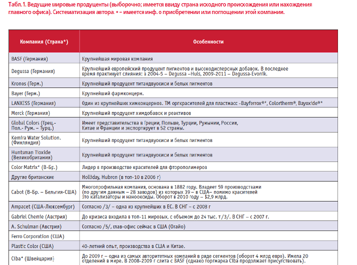 PolyOne перед 2012 г завершила сделку по приобретению ColorMatrix Group, которая относится к числу лидеров в производстве красителей для фторополимеров и силиконов. Правда, для этого понадобился кредит на 0,3 миллиарда долларов. Накануне 2012 г LANXESS заявил о представлении новой линейки пигментов (в частности, красители Bayferrox), премьера которой заявлена на ноябрьской выставке «Abrafati 2011» (Бразилия). Помимо крупных лидеров, существует много региональных компаний – в особенности польских, бразильских, индийских и турецких. Заметим, что среди польских компаний подавляющее большинство расположено не в столице Варшаве, а разбросано по провинциальным городам – Кендзежин, Сохоцин, Карчев, Кельце, Ченстохова. Это отличие от постсоветских стран, где основная жизнь «кипит» возле столиц и мегаполисов. А также от бразильского и мексиканского, где мегаполис Сан-Паулу и столица Мехико «берут на себя» львиную долю производственных площадок окрашивающей химии. Обращаем также внимание на то, что как минимум одна из польских компаний (Swisspigments) распространяет швейцарскую фирму CIBA – ту самую, о покупке которой заявил BASF еще в 2009 году. Это говорит о том, что марка CIBA (а согласно польскому релизу от 3.2012, и вся фирма) пока продолжает благополучно существовать.
