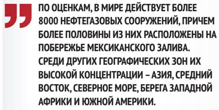 По оценкам, в мире действует более 8000 нефтегазовых сооружений, причем более половины из них расположены на побережье Мексиканского залива. Среди других географических зон их высокой концентрации –Азия, Средний Восток, Северное море, берега Западной Африки и Южной Америки. В настоящее время разведывательные работы ведутся на новых территориях, например, в Арктике. Чтобы доставать залежи нефти, в некоторых частях света буровые установки приходится опускать на 7 миль вглубь моря.