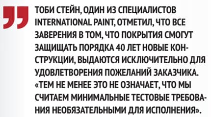 Тоби Стейн, один из специалистов по маркетингу International Paint, отметил, что все заверения в том, что покрытия смогут защищать порядка 40 лет новые конструкции, выдаются исключительно для удовлетворения пожеланий заказчика. «Тем не менее это не означает, что мы считаем минимальные тестовые требования необязательными для исполнения. Всегда необходимо учитывать и полный срок службы покрытия в процессе его эксплуатации. Клиенты хотят испытывать надежность защитных систем, мы предоставляем им такую возможность. При этом не стоит забывать, что не всегда толщина слоя является главным критерием качества, во всем нужно искать баланс. Более того, мы принимаем во внимание методы подготовки поверхности и стойкость к процессам, которые могут нарушить целостность покрытия в течение производственного цикла. Покрытия должны соответствовать всем требованиям для применения и хранения в той же мере, как и отличаться длительностью антикоррозионной защиты при эксплуатации объектов. Требуется большой опыт для распознавания и понимания того, какое покрытие наиболее приемлемо в каждом конкретном случае. Это характерно для всех участков нефтегазовых платформ, независимо от того, что это – зона попадания брызг, погружения в воду, атмосферного воздействия или повышенного нагревания», − разъясняет он.