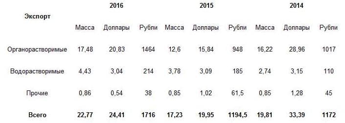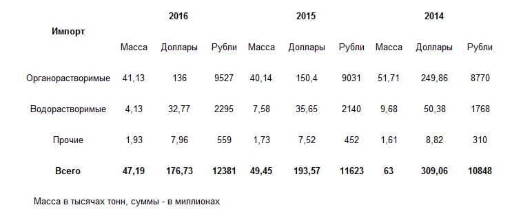 Параллельно росту внутреннего производства, увеличился объем импорта сырья для ЛКМ. Так, за треть года было импортировано 217 тонн этой продукции (+ 61 %) на 703 тысячи долларов (+ 62 %). В пересчете на российскую национальную валюту было потрачено 49,2 млн рублей. Рост расходов составил 89 %.