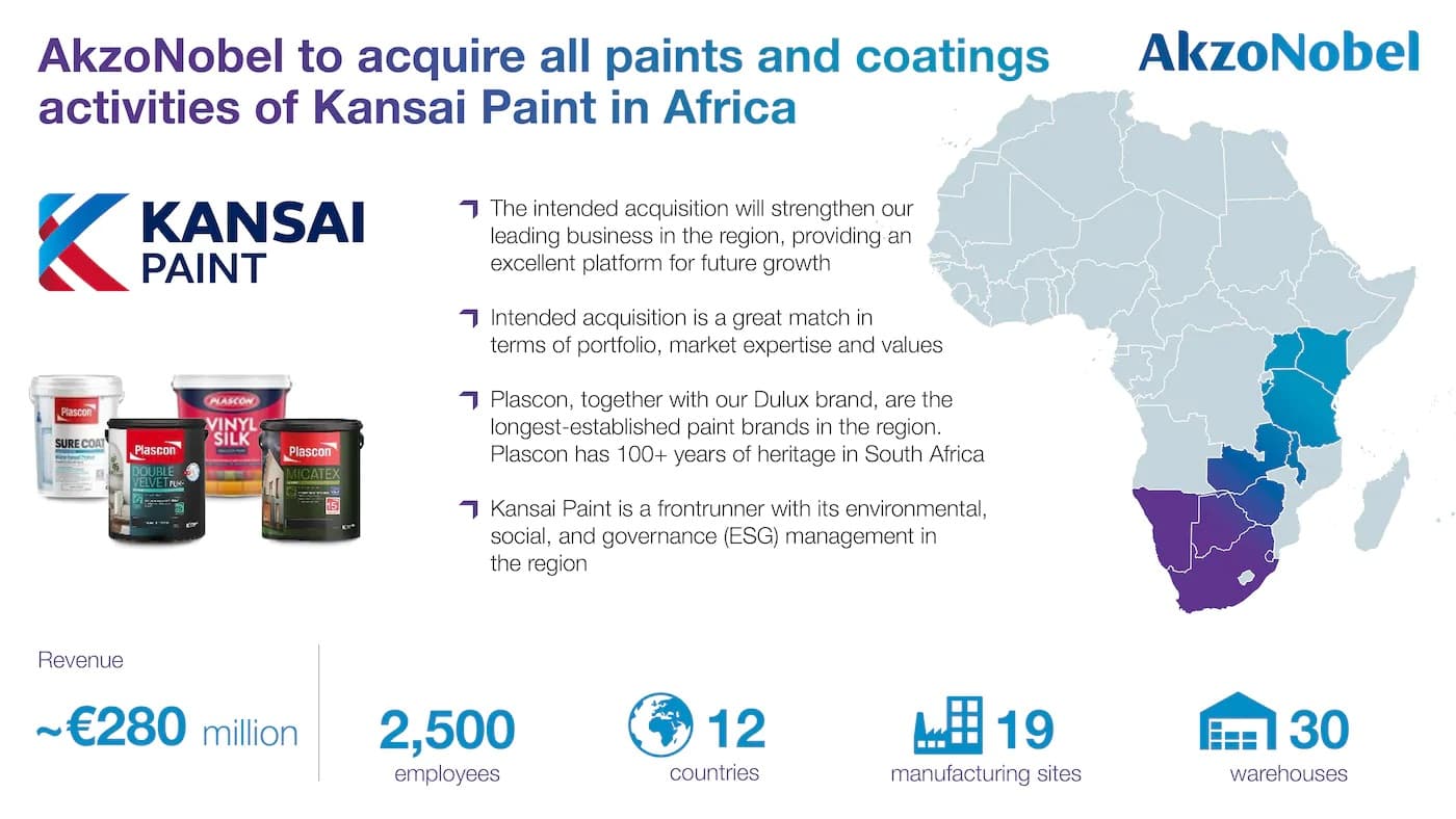 AkzoNobel 1 июня объявил о приобретении лакокрасочного бизнеса в Африке у Kansai Paint. Финансовые условия контракта не разглашаются. Как сообщает AkzoNobel, компания Kansai Paint представлена 12 странах Африки, а выручка от продаж составляет около 280 млн евро.