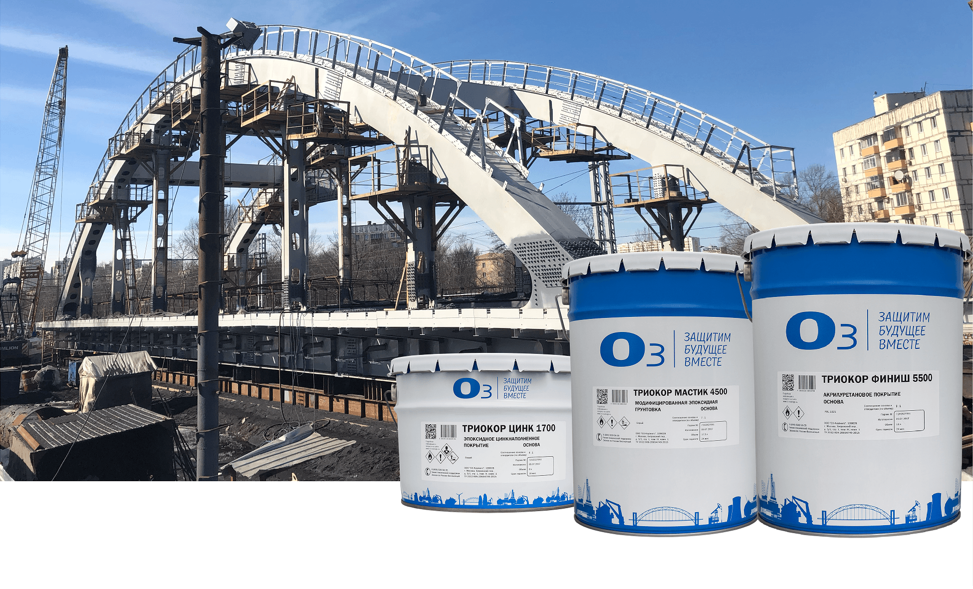 Металлические пролеты путепровода на Ярославском направлении защищены трехслойной антикоррозионной системой ТРИОКОР ЦИНК 1700 + ТРИОКОР МАСТИК 4500 + ТРИОКОР ФИНИШ 5500 от Компании О3. Срок службы такой системы – не менее 28 лет.