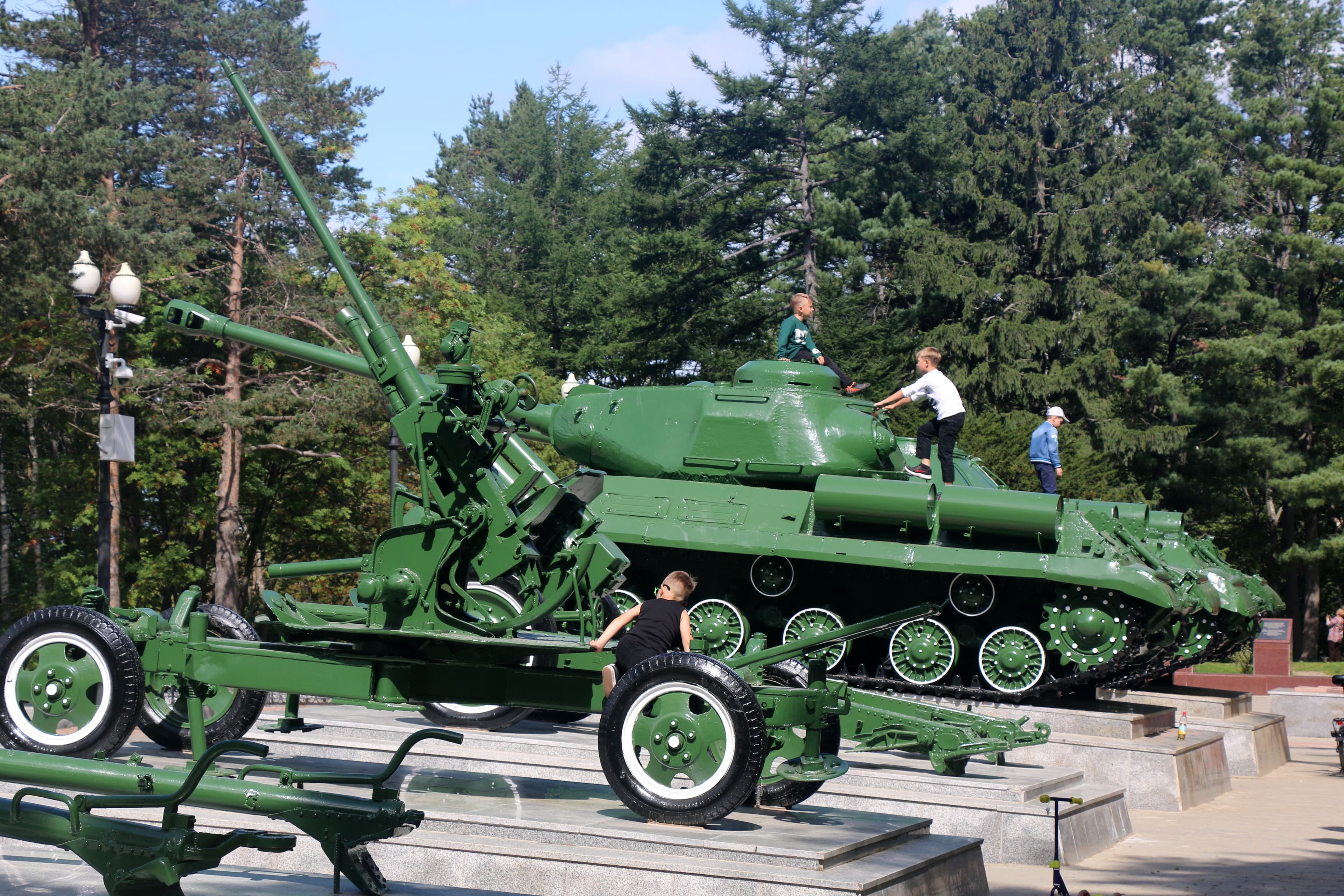 Шесть боевых орудий времен Второй мировой войны были установлены на верхней площадке площади Славы в 2013 году. За пять лет под открытым небом военная техника сильно пострадала. На танках и пушках облупилась краска, на некоторых деталях появилась сквозная ржавчина.