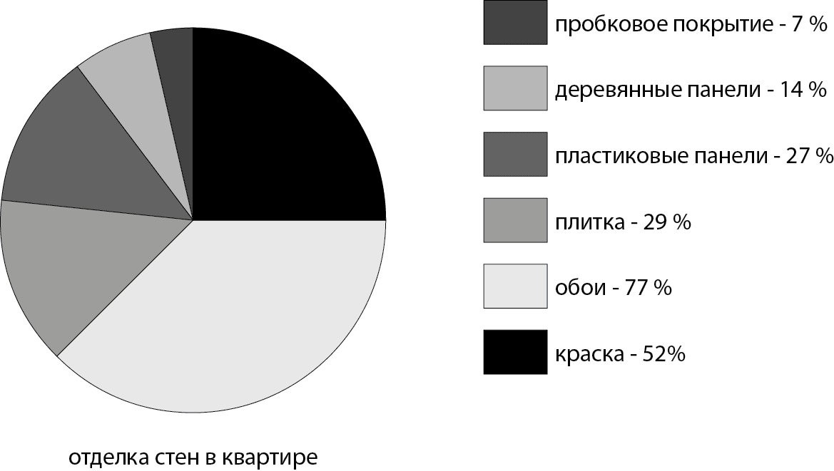 Для отделки стен в жилых комнатах квартиры 52 % опрашиваемых отдают предпочтение интерьерным краскам и декоративным штукатуркам, 43 % окрашивают потолки, 6 % покрывают пол эмалью, лаком или деревозащитным составом. Для отделки стен кухни 33% респондентов остановили свой выбор на краске или декоративной штукатурке. Побелить поток кухни решились 8%. Всего 2% россиян окрашивают на кухне пол.