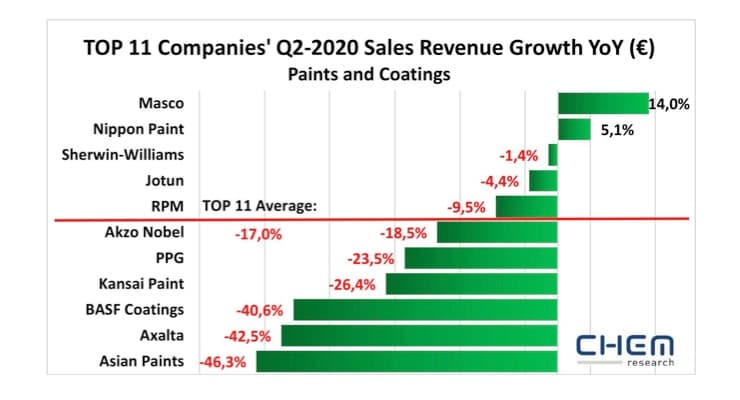 Падение продаж лакокрасочных материалов во втором квартале среди ведущих мировых производителей из Топ-11 достигло 17% относительно аналогичного периода 2019 года.