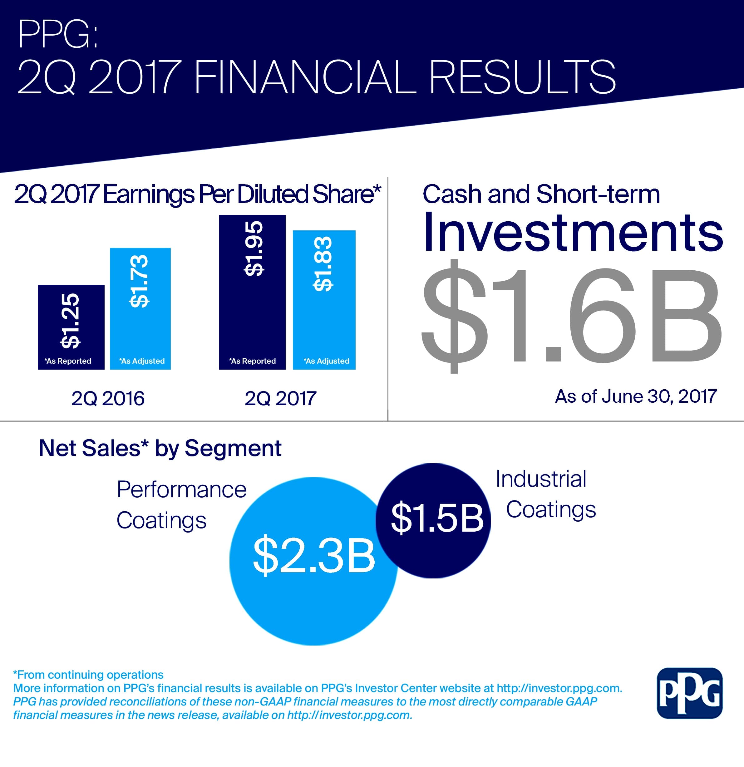 За три месяца, с апреля по июнь, чистый объем продаж PPG составил 3,8 млрд долларов США, что ниже показателя прошлого года. Для сравнения, во втором квартале 2016 американская компания отчиталась об объеме продаж в 4,1 млрд долларов США – на 1 % меньше, чем годом ранее. В местных валютах объем продаж снизился на 2 % или около 65 млн долларов.