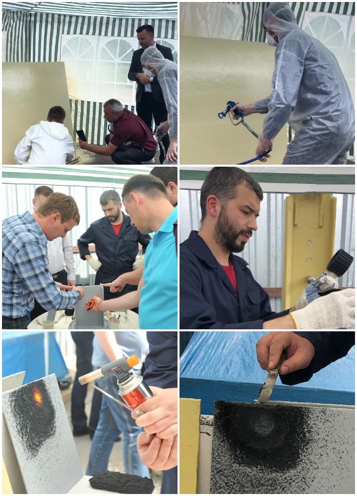 В первый день для гостей была организована практическая часть конференции, где каждый участник смог воочию наблюдать за нюансами применения составов «ДЕКОТЕРМ». Демонстрационные точки возглавили специалисты лаборатории ООО «Территория цвета» и квалифицированные инспекторы по выкрасам. На оборудованных площадках прошли мастер-классы по нанесению составов, тесты на адгезию, ударопрочность и влагостойкость, а также продемонстрирован процесс образования кокса в результате воздействия огня. Желающим была предоставлена возможность выполнить все манипуляции с огнезащитными составами своими руками и убедиться в их надёжности и технологичности.