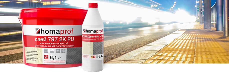 В чем же секрет успеха клея homaProf 797 2K PU? Во-первых, он подходит к любому типу основания. Им можно склеить резиновое (каучуковое) основание (в том числе спортивное), искусственную траву, покрытия из ПВХ, текстиля на впитывающие и невпитывающие основания (бетон, цементная и гипсовая стяжка, асфальт, дерево, металл, керамическая плитка, ПВХ и различные полимерные покрытия). Во-вторых, состав применяют как для внутренних, так и для наружных работ. Клей не боится перепадов температур и влаги, поэтому его часто используют для работ в ванных комнатах, бассейнах, на открытых террасах. Состав не содержит органических растворителей, имеет экономный расход (450-1200 г/м²), время укладки составляет 50-90 минут.