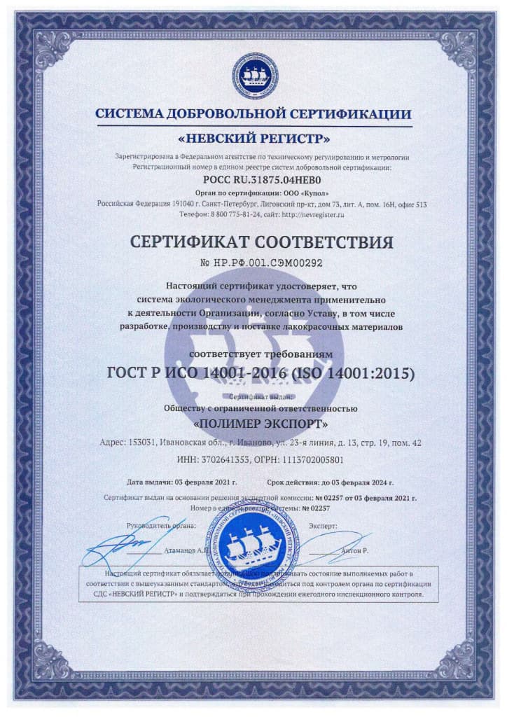 Компания «Полимер Экспорт» в феврале 2021 года получила экологический сертификат, который удостоверяет, что система экологического менеджмента организации соответствует ГОСТ Р ИСО 14001-2016 (ISO 14001:2015). Настоящий стандарт подтверждает экологическую безопасность выпускаемой продукции и технологических процессов на производстве. Сертификат свидетельствует о том, что в лакокрасочных материалах «RAUM-PROFIE» содержание вредных веществ не превышает нормативов, установленных Российскими и Международными стандартами. На протяжении всего жизненного цикла – от стадии производства до стадии утилизации – наши покрытия не наносят вреда окружающей среде и здоровью человека. Официальное подтверждение соответствия лакокрасочных материалов эко-стандартам предоставляет право наносить на упаковку специальную маркировку, которая поможет потребителю легко отличить экологически безопасную продукцию от другой на рынке.
