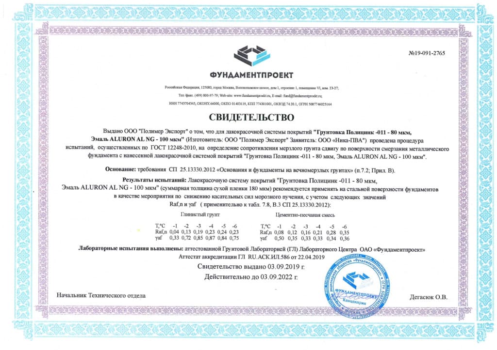 Компания «Полимер Экспорт» получила сертификат от Лабораторного Центра ОАО «Фундаментпроект» на систему покрытий «Грунтовка Полицинк – 011 – 80 мкм, Эмаль ALURON AL NG – 100 мкм» на основании требований СП 25.13330.2012 «Основания и фундаменты на вечномерзлых грунтах». Данная система применяется при строительстве в одних из самых сложных условиях - в регионах арктического климата, особенностью которого являются вечномерзлые грунты. По результатам испытаний данную систему рекомендуется применять на стальной поверхности фундаментов с целью снижения касательных сил морозного пучения.