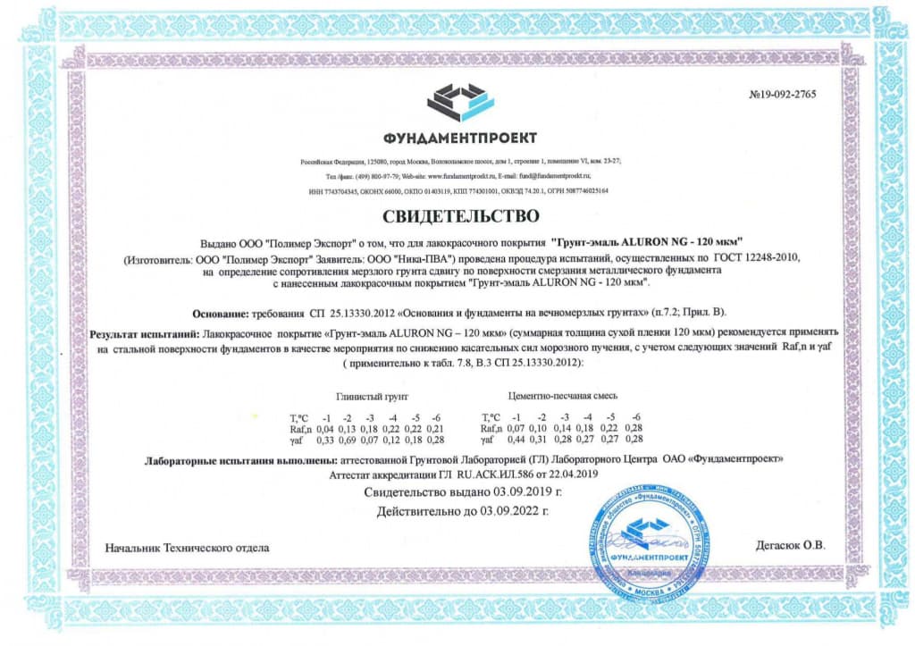 Лабораторным Центром ОАО «Фундаментпроект» (проектно-изыскательный институт) была проведена процедура испытаний для лакокрасочного покрытия «Грунт-эмаль ALURON NG», осуществленных по ГОСТ 12248-2010, на определение сопротивления мерзлого грунта сдвигу по поверхности смерзания металлического фундамента с нанесенным лакокрасочным покрытием «Грунт-эмаль ALURON NG». Результаты испытаний подтвердили эффективность применения материала на стальной поверхности фундаментов, на что компания «Полимер Экспорт» получила соответствующее свидетельство.