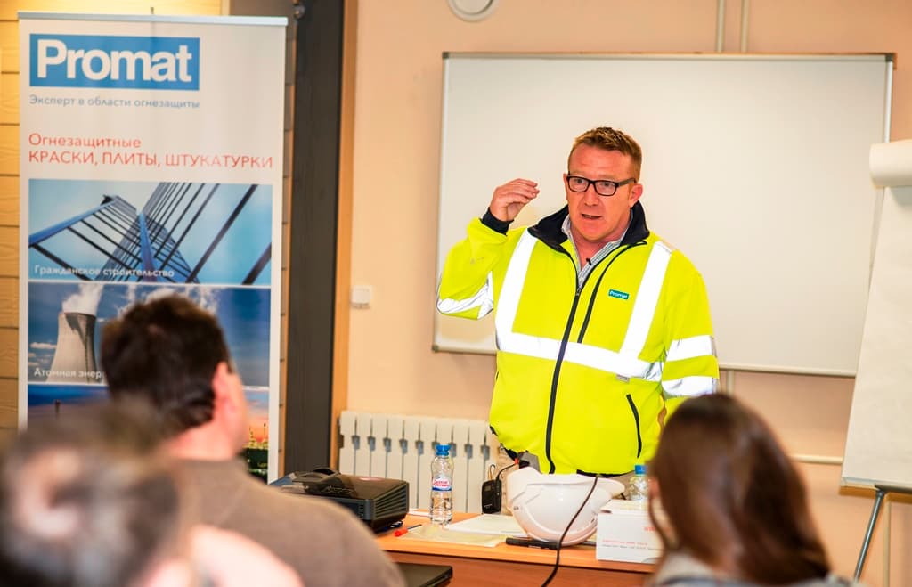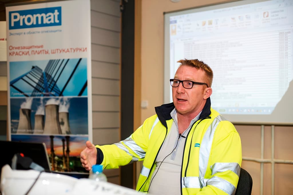 Обучение, совместно с техническими специалистами компании, проводил специально прибывший представитель Promat из Великобритании Джон Алдер, работающий с огнезащитной системой FENDOLITE MII уже много лет.