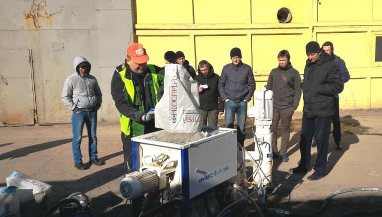 В первой части мастер-класса подробно было рассказано о самом материале, его преимуществах и технологии производства. Технические специалисты компании раскрыли все свойства штукатурного состава НЕОСПРЕЙ, тонкости технологии нанесения и эксплуатации.