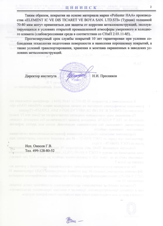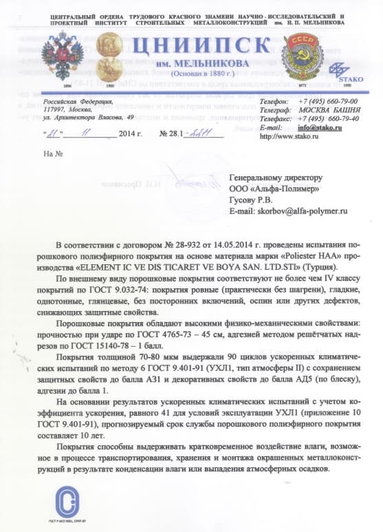 Порошковые краски турецкой компании Element прошли испытания и получили сертификат ЗАО «ЦНИИПСК им. Н. П. Мельникова». Это обязательный документ для материалов, используемых в сфере ЖКХ, строительстве, и других отраслях промышленности.