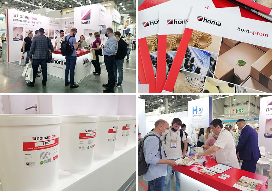 Представленная на стенде компании Хома продукция пользовалась повышенным вниманием. Cотрудники техподдержки ознакомили посетителей с новинками производства, рассказали о современных тенденциях использования клеев и дисперсий. Промышленные клеи homa разрабатываются с учетом потребностей производителей. Например, прочность склеивания особо важна в изготовлении гофрокоробов. В соответствии с этим мы выпускаем на столько прочный клей, чтобы место склейки при тестировании разрывалось вместе с материалом. А для производства пакетов необходима прежде всего высокая скорость склеивания, и наш продукт склеивает поверхности всего за 4 секунды.