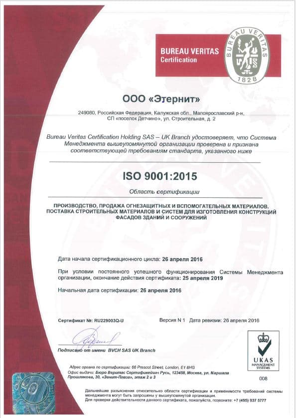 Компания «ЭТЕРНИТ», производитель и поставщик материалов для пассивной огнезащиты всех видов строительных конструкций и инженерных коммуникаций PROMAT (ПРОМАТ), объявляет об успешном завершении сертификации системы менеджмента качества по международному стандарту ISO 9001:2015.