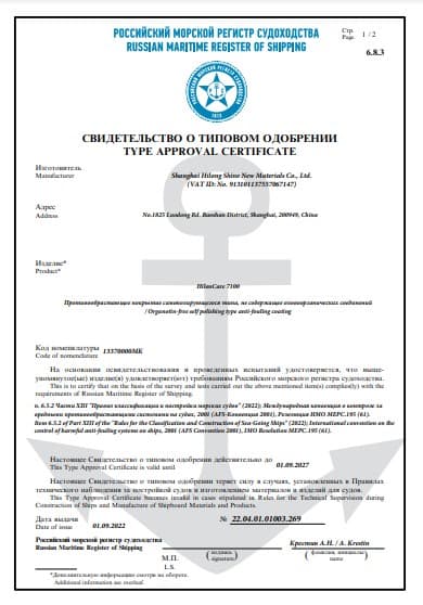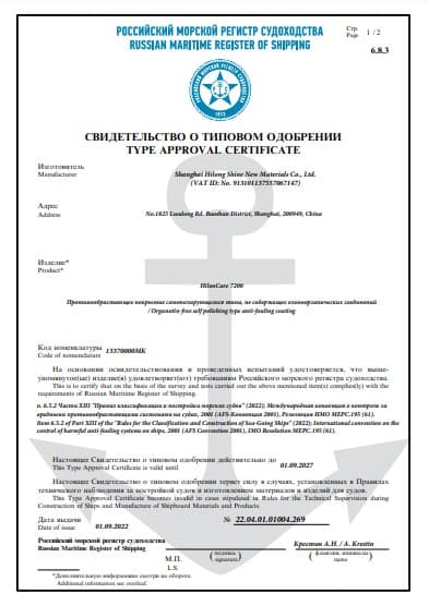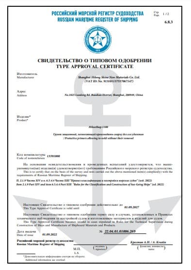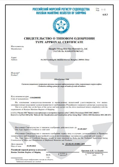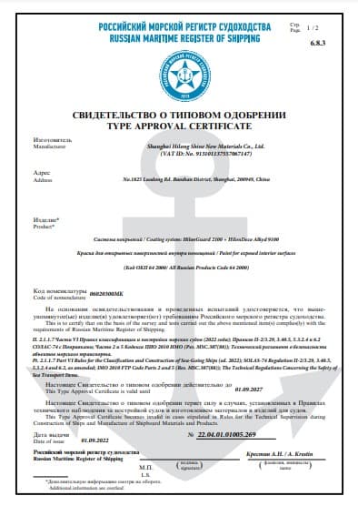 Система контроля качества предприятия Shanghai Hilong Shine New Materials Co., Ltd. проверена и признана соответствующей требованиям РМРС. Российский Морской Регистр Судоходства выдал свидетельства о типовом одобрении судовых еще 6 покрытий Hilong. Сертификаты одобрения получили материалы для окраски подводного борта, грузовых танков и шоппраймер. В перечень одобренным материалов вошли: