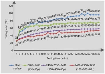 Использование комбинированной системы, одновременно отражающей излучение от поверхности покрытия и изолирующей тепловой поток к стенке резервуара позволяет добиться высоких результатов в защите от потерь при испарении нефтепродуктов. Светоотражающая теплоизоляционная система превосходит традиционные системы окраски в светлых тонах: температура поверхности покрытия снижается на 16 ℃, а температура стенки снижается на 25 ℃. Без покрытия температура стальной поверхности достигала более 90 ℃, в то время как температура стенки, окрашенной традиционной антикоррозионной схемой составила не более 76 ℃. Температура стенки, покрытой светоотражающим теплоизоляционным слоем составила не более 59 ℃ в зависимости от толщины теплоизоляционного слоя. Полученные значения на 22 % выше традиционных систем и практически вдвое выше результатов без покрытия.