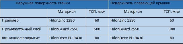 HilonZinc 1280, комплексную с использованием цинк-фосфатного праймера HilonGuard 2320 или барьерную с использованием толстослойных толерантных к подготовке поверхности покрытий HilonGuard 2400 или HilonFirm 5550. Теплоизоляционное промежуточное покрытие HilonGuard 2550, высоконаполненное полыми стеклянными микросферами с низкой теплопроводностью до 0,05 Вт/м·К, предотвращает теплопередачу от внешней среды к стенке резервуара и внутренней среде и из резервуара наружу, значительно снижая потери при «малых дыханиях». Покрытие может наноситься толщиной 300-900 микрон в зависимости от требуемых температурных условий эксплуатации резервуара. Светоотражающее акрил-уретановое покрытие HilonDeco PU 9430, содержащее отражающие ИК-излучение пигменты, обеспечивает защиту поверхности от нагревания и атмосферного воздействия.