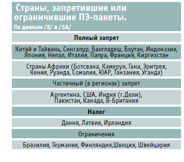 По информации Министерства регионального развития, строительства и ЖКХ Украины, полный запрет на полимерные пакеты уже действует в таких странах, как Италия, Франция, Австралия, Китай, Сингапур, Бангладеш и Тайвань. Сейчас уже 25% населения живут в зонах, «свободных от пакетов». В дальнейшем их будет, видимо, больше, поскольку запретная мода расширяется на Европу и СНГ.
